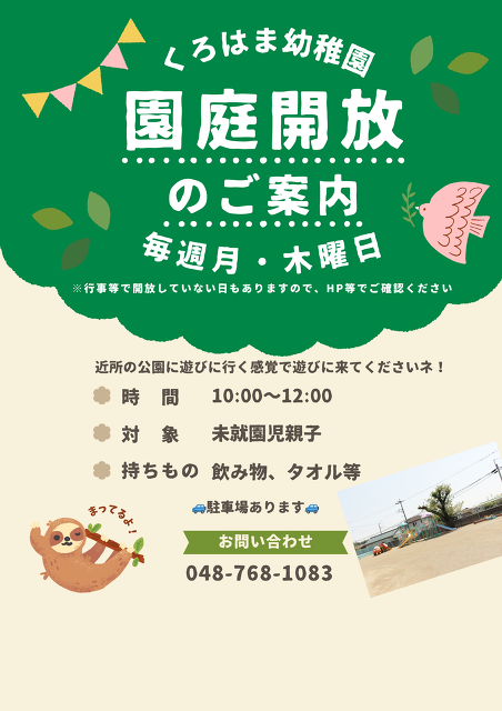毎週月・木曜日の日程にて園庭開放を行ってます。未就園のお子様が近所の公園へ遊びに行く感覚で親子で幼稚園に遊びに来て下さいね(^O^)/